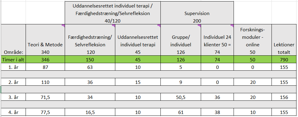 Undervisningstimerne omfatter herunder også forskningsmoduler, som indgår som en integreret del af uddannelsen og understøtter de studerendes forståelse af forskningsbaseret viden, videnskabelig metode og faglig refleksion i relation til psykoterapeutisk praksis.