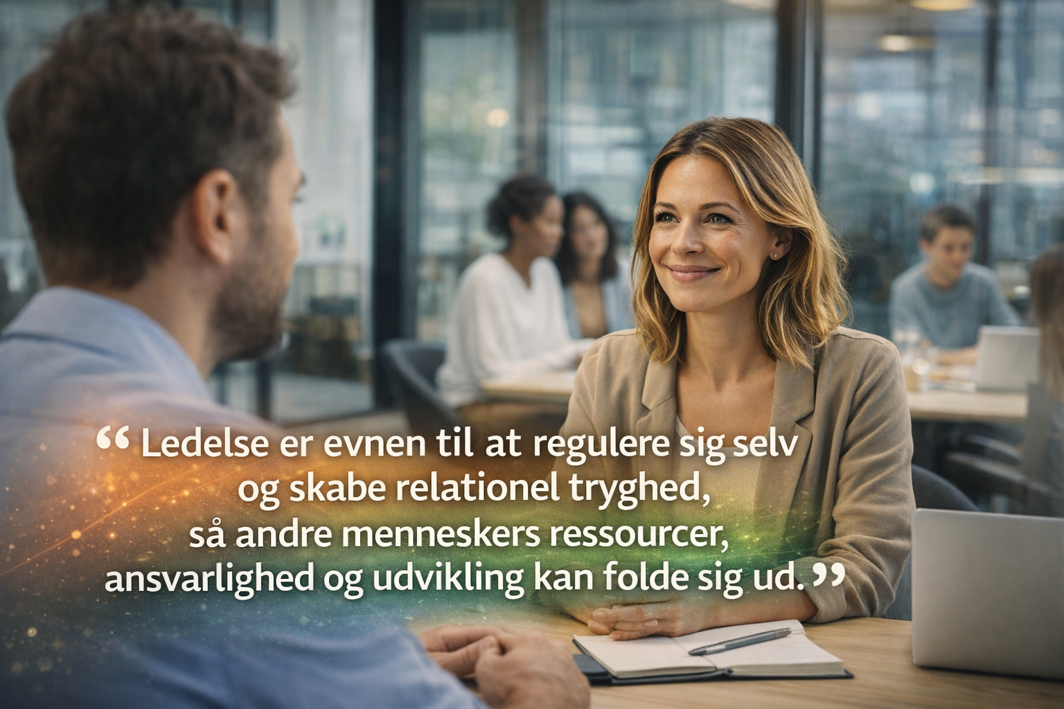 ”Ledelse er evnen til at regulere sig selv og skabe relationel tryghed, så andre menneskers ressourcer, ansvarlighed og udvikling kan folde sig ud.”